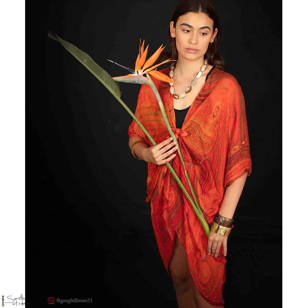 These stunning open kaftan designs are created for you from fine artworks by renowned Indigenous artist Saretta Fielding. Combine a sophisticated drape shape and breezy open front with a stunning artwork print for easy elegance!